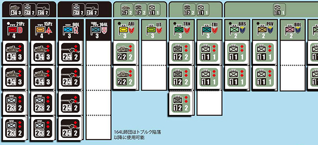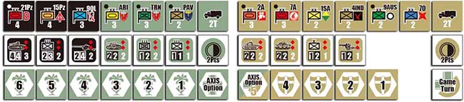 さらに、各プレーヤーは手番ごとに受け取るコマンドの量が異なり、得たコマンドの数だけ移動・攻撃を実行できますが、得られるコマンドの数は独軍が優位にあり、これによってシンプルなシステムで北アフリカ戦のダイナミズムと流動的な展開をスピーディに再現します